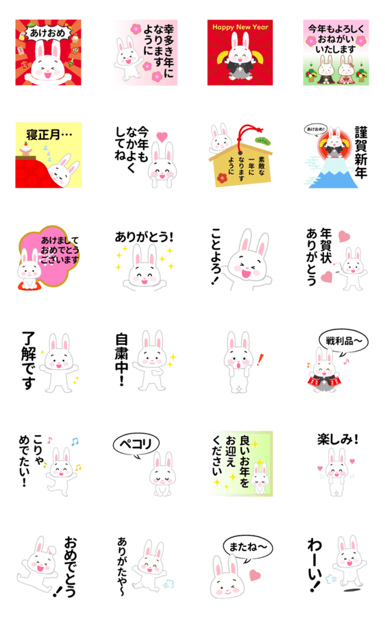 | スタンプ説明 | 干支「卯」の年末年始のご挨拶にぴったりなスタンプ。 年賀状や普段使いも可能な言葉入り。うさぎ好きな方にも是非。 |