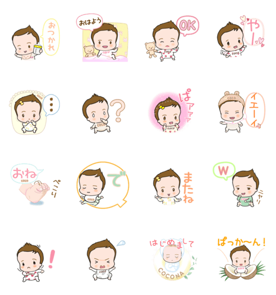 | スタンプ説明 | わたしの名前はココナ みんなに愛されて少しずつおおきくなるから毎日使えるスタンプで成長を楽しんでね |