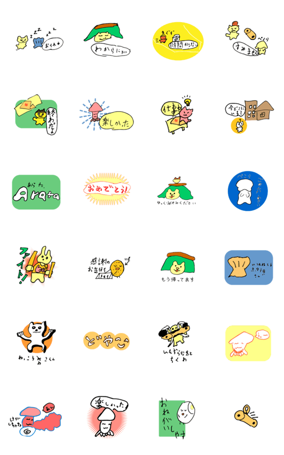 小学4年が絵描いたゆる〜いスタンプ。売り上げで好きな漫画を買います。意外と使いやすい!ときどき竹輪がいるよ!