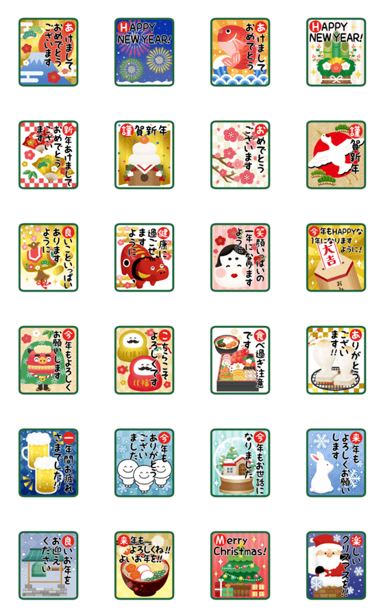| スタンプ説明 | 昔ながらのかるた風スタンプです♪家族・友人・仕事仲間とどんな年代でも使いやすいです!年末年始/あけおめ/年賀状/謹賀新年/クリスマス/冬 ※こちらは再販スタンプです |