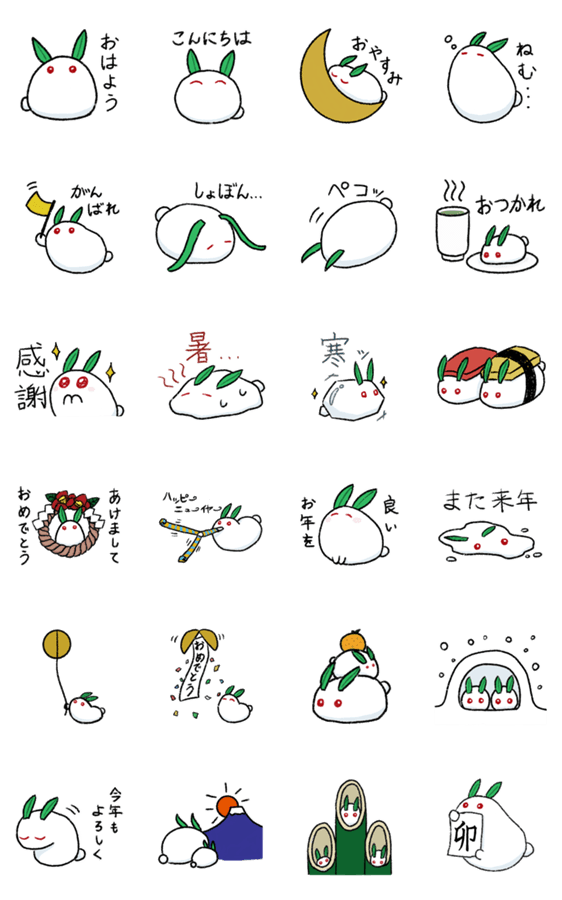 年末年始の挨拶の他、普段使いもできそうな雪うさぎたちのスタンプです。