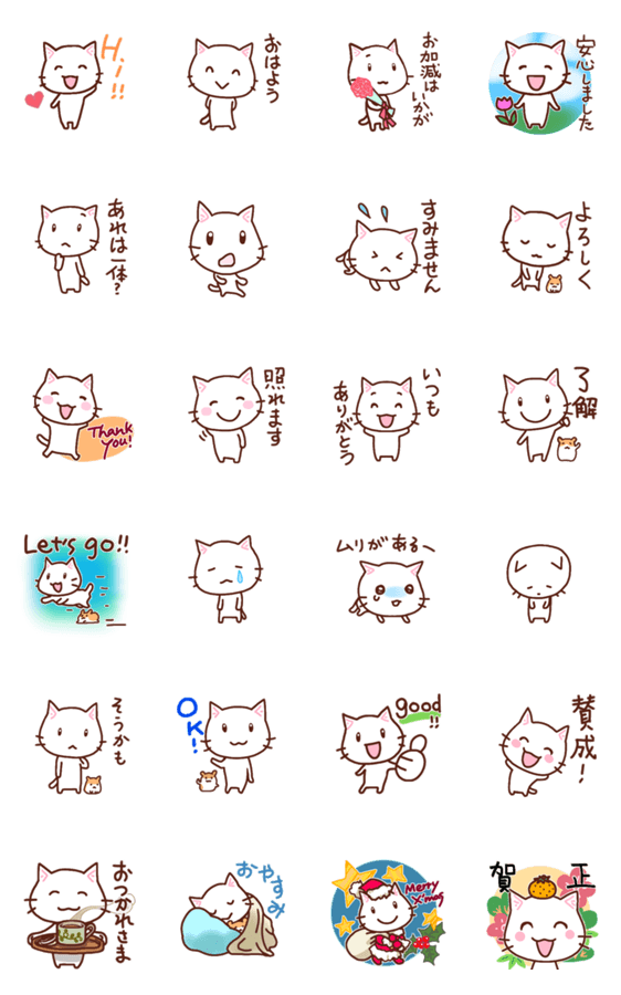 白猫リリの、普段使いしやすいスタンプです クリスマスやお正月にもどうぞ