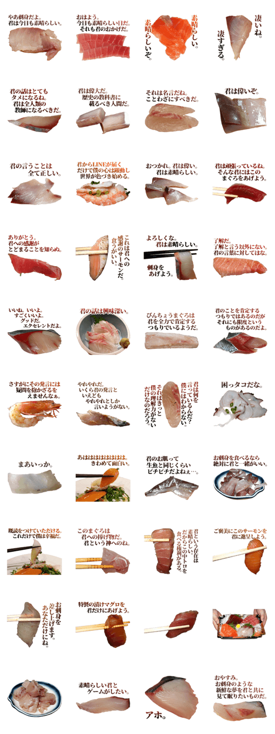 お刺身が相手のすべてを肯定するスタンプです。肯定は最強のコミュニケーション。さしみ、刺し身、魚類、生魚、まぐろ、中トロ、サーモン、タコ、イカ、等。実写食べ物。