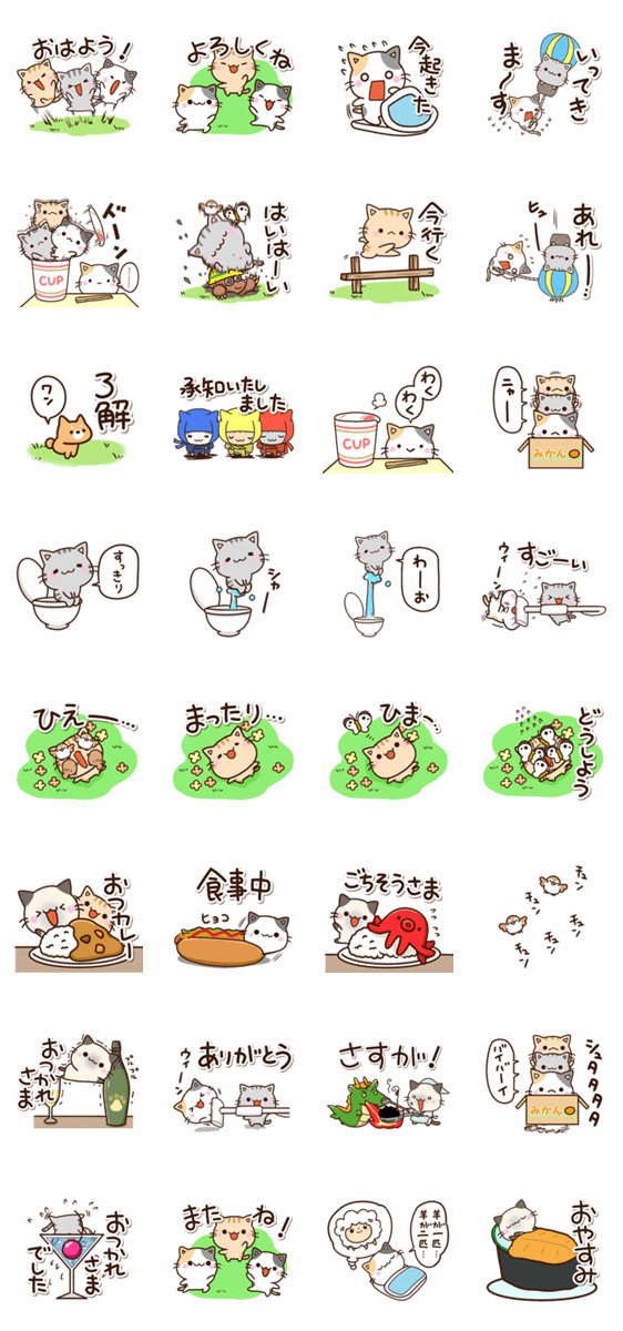 『かたこ』が『LINEマンガ』や『X(旧Twitter)』『インスタ』に載せた『ちびネコ』のコマをスタンプにしました。使いやすいように抜粋してます。三毛猫・アメショ・ハチワレ