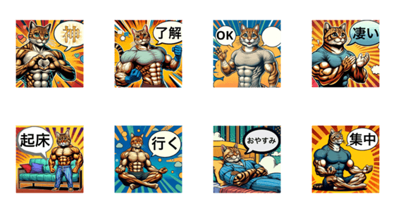筋肉モリモリの茶トラのスタンプ。普段使いや待ち合わせ時などに使える内容になっています!(AIの力を借りて作成しました!)