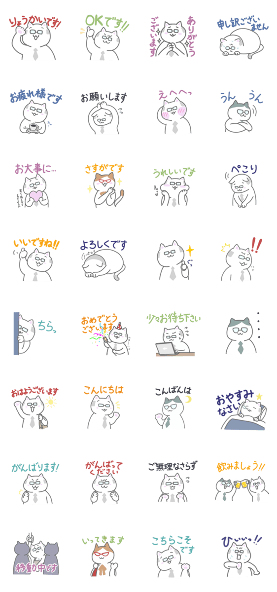 お仕事を頑張るぽっちゃり気味な猫達のスタンプです。敬語が多めなので、ビジネスやママ友・パパ友との会話に使いやすいです。