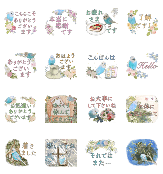 薔薇などのお花の水彩画と、インコの写真のスタンプです。大人が使いやすい、基本の日常会話。花/小鳥/可愛い/優しい/丁寧/気づかい/水彩/思いやり/あいさつ