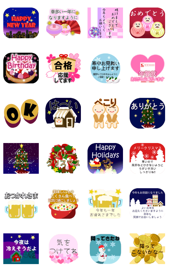 クリスマスメッセージや年末年始の挨拶につかえるスタンプ詰め合わせです。家族で(親から子へ)友達、先輩後輩、お知り合いの方々などなどに送ってね。