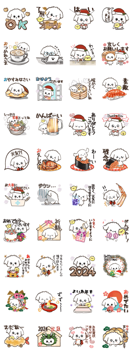 キュートな愛犬ワンコで優しくて使いやすいスタンプです♪毎日/マルチーズ/犬/挨拶/年中/ペット/愛犬/モフモフ/毎日/ふんわり/大人/日常/気遣い/敬語/寿司/食べ物/Bnasuko