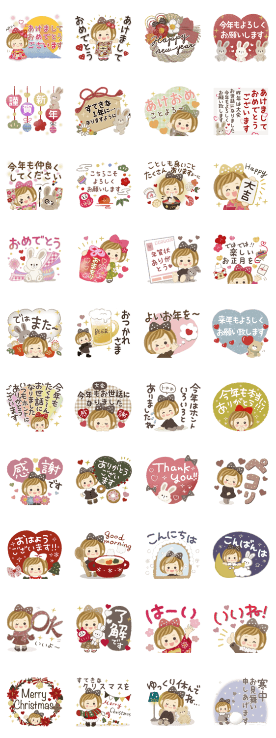 ※こちらは再販の為、以前販売したものと内容は同じです。 ボブヘアーの可愛い女の子のお正月年末年始に使いやすいスタンプです♪うさぎ/くま/ガール/花/年末年始