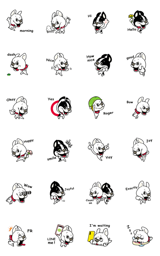 ワンちゃんのシンプルで使いやすい可愛いスタンプです。ほぼ同じの文字なし版と日本語版もあります。