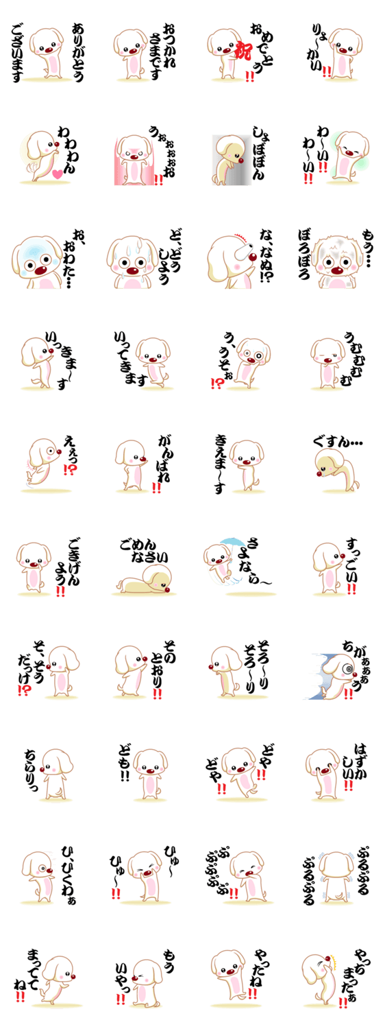 | スタンプ説明 | 白くて、胴が長い、犬みたいなやつです。こんなやつですが、使ってやってください。3段目から、五十音順になっています。 |