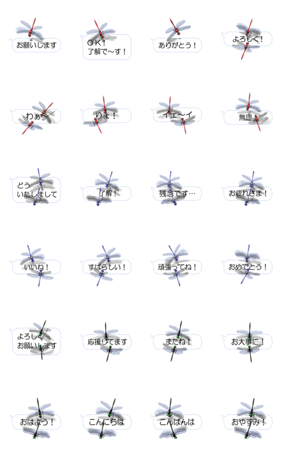 | スタンプ説明 | トンボがスマートフォンの上を飛んでいるように見える「アニメーションスタンプ」です。 |