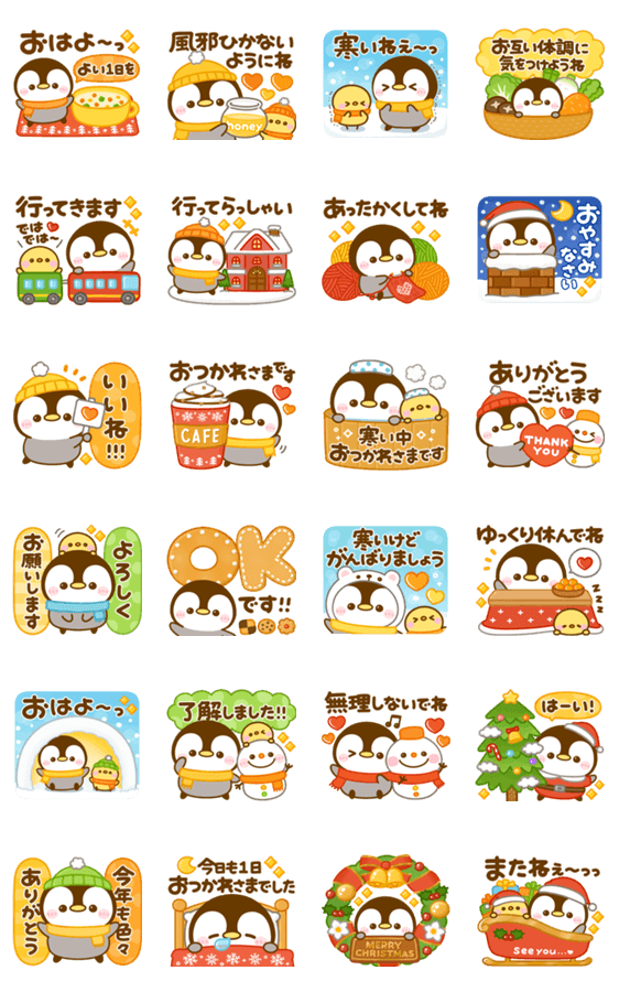 小さなペンギンの赤ちゃん、ぺんぺんが画面いっぱいに飛び出して動く冬のポップアップスタンプです。