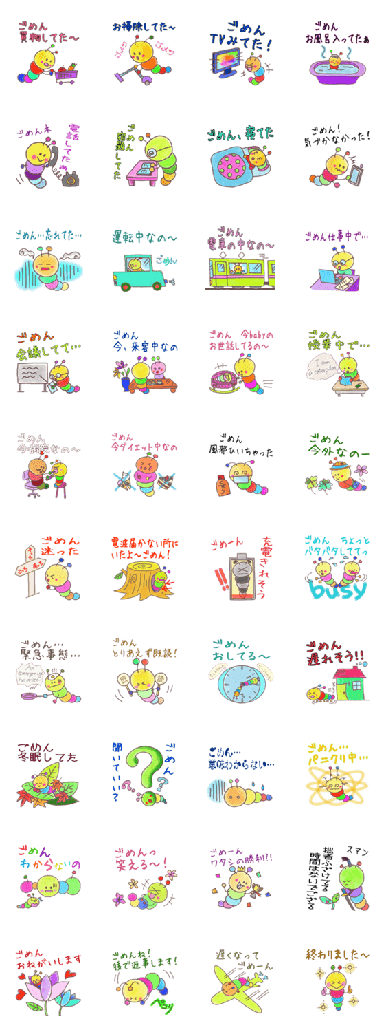 あなたと「いつ」も「いっ」しょにいたい。いついつスタンプ「色々なごめんね」シリーズです。時間がない時などに、可愛い芋虫があなたの代わりにごめんを言ってくれます。