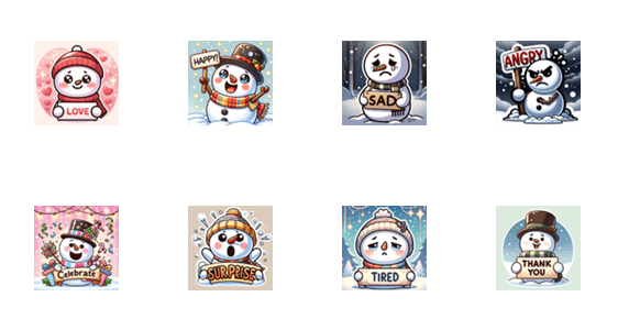 普段、話すことができない雪だるまくんはそれぞれ自分の感情を伝えようと頑張っています。どうかこの雪だるまくんたちの頑張りに免じて使ってやってください。