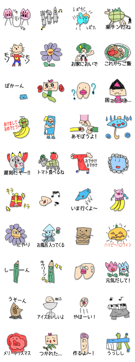| スタンプ説明 | 7歳の女の子、ひよこちゃんが考えて作った、とってもシュールなスタンプ。子供ならではの奇想天外なユニークの絵。ちなみにひよこちゃんの将来の夢は、絵本作家さん。 |