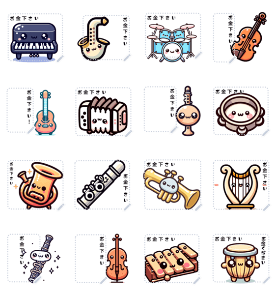音楽愛好家のための特別なメッセージスタンプです。ピアノ、ギター、バイオリンなど、様々な楽器が描かれたこのスタンプは、あなたのメッセージに音楽の魅力を加えます。 現在この商品は一部のスマートフォン版LINE 10.3.0以上のトークルームでのみ使用できます。動作環境の最新情報はヘルプをご確認ください。