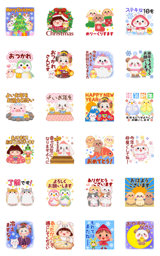 トイプードル、ペンギンpem pem、まいこはん、てぶりん、いろんなキャラクターの年末年始に使えるスタンプです。昨年のスタンプの再販です。