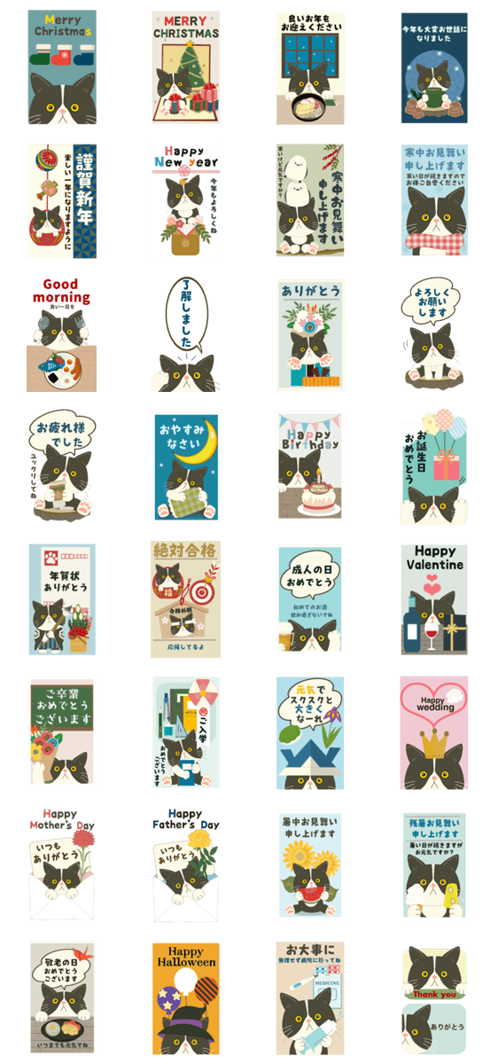 可愛いハチワレ猫のぶーにゃんの年中使える便利なスタンプです。 (お正月/年賀状/寒中見舞い/クリスマス/年末年始/おめでとう/誕生日/成人の日/父の日/母の日/合格/入学) ※このスタンプはトークルームで大きく表示されるBIGスタンプです。