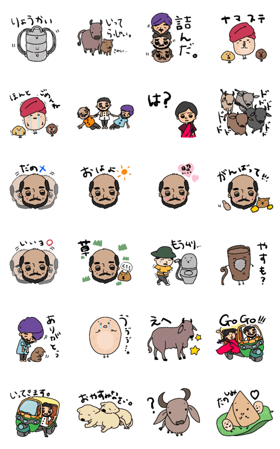 インドおじさんと動物、ストリートフードたちが大集合したスタンプ集。日常使いできるスタンプから用途のよく分からないスタンプまで盛りだくさん。