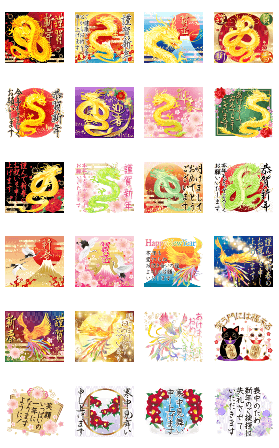 黄金龍や鳳凰が彩る新年の挨拶に使えるお正月ポップアップスタンプ。初日の出、富士山、桜など日本の美しいモチーフが優美に動きます。男女年齢問わず毎年使えます。(あけおめスタンプ2024対象)