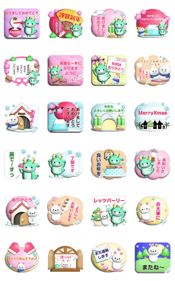 | スタンプ説明 | 年末年始の挨拶/お正月/クリスマス/新年/年賀/スタンプ/辰/タツ/兔/うさぎ/ほんわか/かわいい/あけましておめでとう/了解です/ありがとう/よろしく/お大事に/mamama-chin(あけおめスタンプ2024対象) 現在この商品は一部のスマートフォン版LINE 10.3.0以上のトークルームでのみ使用できます。動作環境の最新情報はヘルプをご確認ください。 |