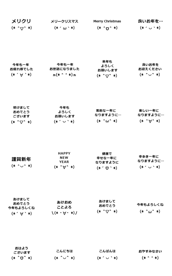 文字が動く!!顔文字スタンプ。シンプルで男女問わず使いやすい♪かおもじ/シンプル/敬語/冬イベント/クリスマス/お正月/あけおめ/年末年始/挨拶/友達/先輩/年上/毎年使える(あけおめスタンプ2024対象)