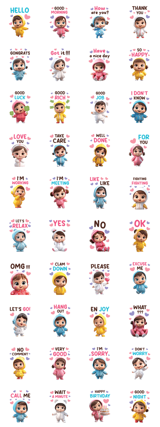 | スタンプ説明 | Cute girl with good words, easy to use words, good morning, okay, thank you, love you, Can be used every day. These stickers will show up extra large in chats. |