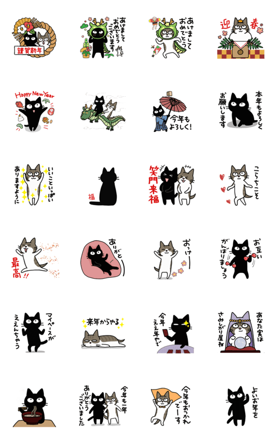 黒猫ナノとキジシロ猫きなこの動くあけおめスタンプ(あけおめスタンプ2024対象)