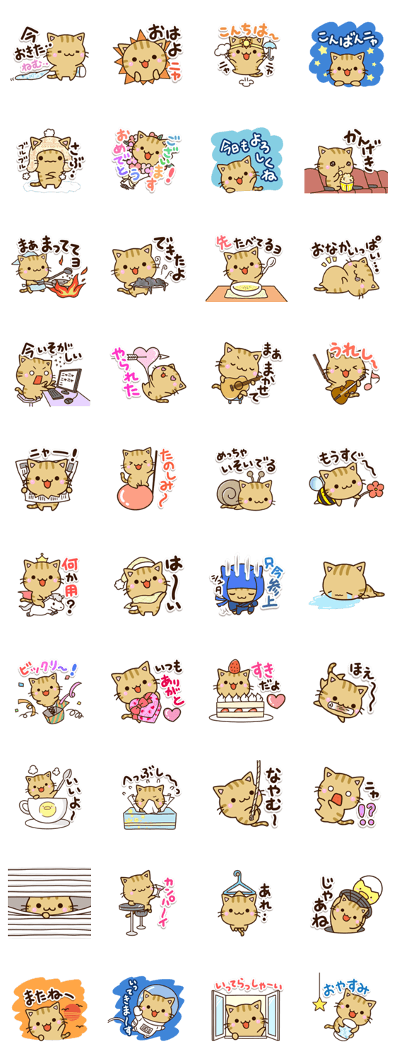 かわいいキジトラ猫スタンプ。基本的な言葉や、よく使うあいさつ等、便利なネコスタンプです。サバトラ、こげ茶のとらねこや、アメショが好きな方にもぜひ。【かたこ】