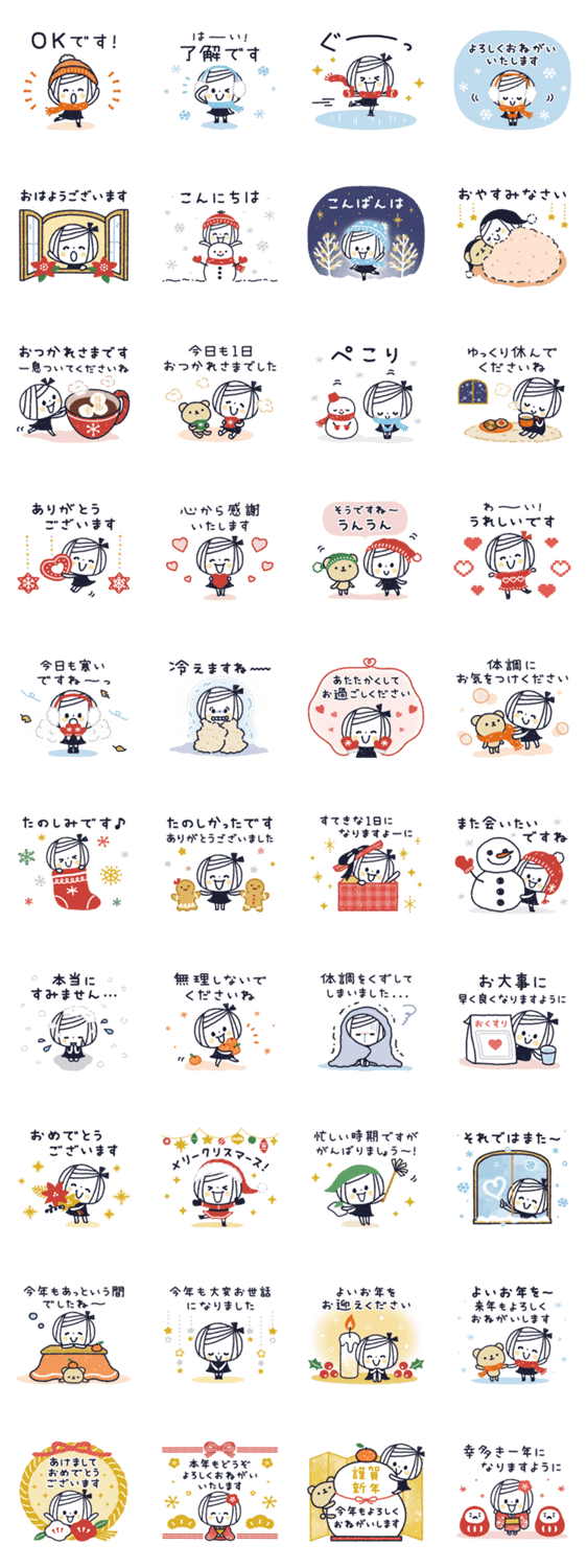 冬の日常と年末年始に使える、ゆるボブGIRLのスタンプです♪文章は敬語です*。..毎年使える/クリスマス/大晦日/新年/お正月/挨拶/気遣い/丁寧/大人かわいい/女の子