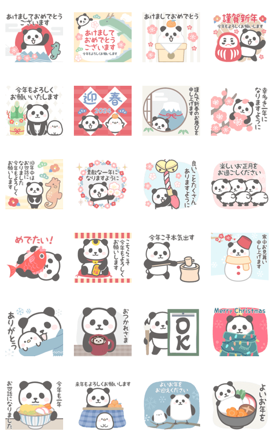 | スタンプ説明 | 年末年始、正月に使えるパンダンミニの飛び出すスタンプです。大晦日/クリスマス/挨拶/冬/丁寧/かわいい/敬語/新年/日常/辰/たつ/干支(あけおめスタンプ2024対象) |