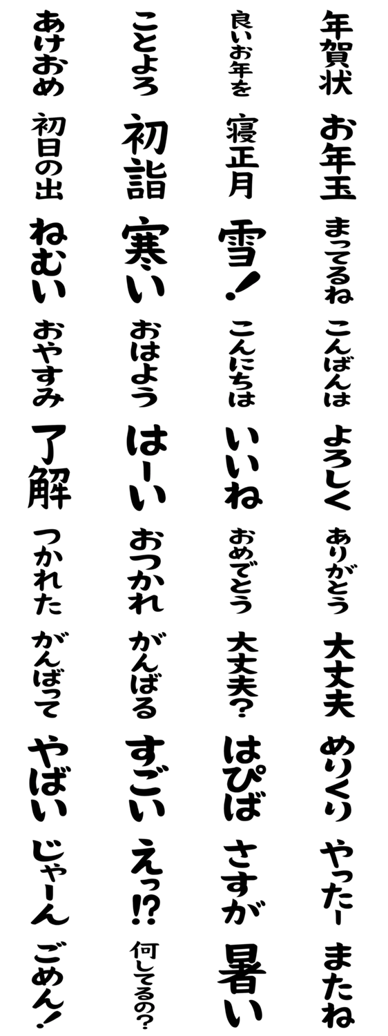 年末年始や日常で使える文字のみのBIGスタンプです。白フチ付き。友だちや家族に。 あけおめ/ことよろ/良いお年を/お年玉/寝正月/初詣/メリクリ/寒い/雪/デカ文字(あけおめスタンプ2024対象)