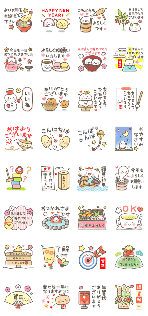 年末年始によく使う基本の言葉を集めました。ほのぼの優しい癒し系。カラフルタッチが大人可愛い!大晦日やお正月の挨拶に使える便利なスタンプです。年賀状がわりに。冬。(あけおめスタンプ2024対象)