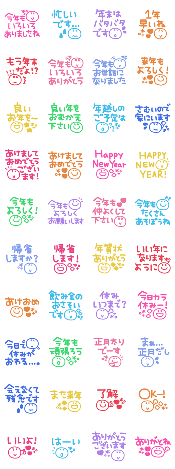 カラフルなスマイルのあいさつスタンプです。 カラフル/スマイル/デカ文字/シンプル/あいさつ/年末年始