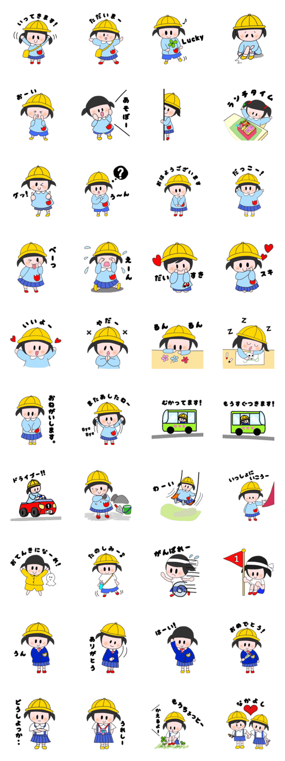 毎日楽しいこといっぱいの幼稚園! わんぱくで愛嬌たっぷり、キュートな女の子が主役のスタンプです。