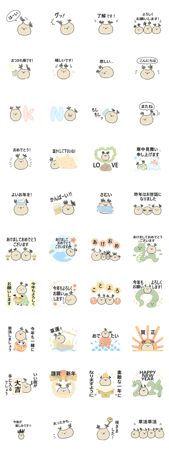 丸くてぽてっとしたアフリカ、マダガスカルの植物「グラキリス」のスタンプ。 冬、正月に使いやすいものから、植物好きの会話に添えやすいセリフも入っています! #植物(あけおめスタンプ2024対象)
