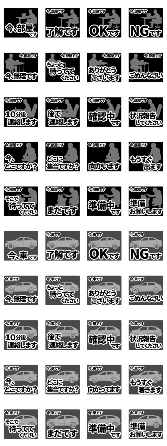 | スタンプ説明 | 部屋・車からの連絡用。文字打ってるヒマない!そんな時に使えるスタンプです。偏光レンズでもOK!探しやすい大きい文字です。友達言葉版、カラー版もあります。 |