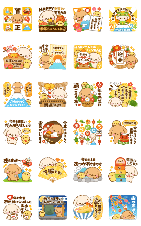 2024年を華やかに彩る♡といぷーのモカちゃん・ラテくんが画面いっぱいに飛び出して動くポップアップスタンプです。年末年始/お正月/あけおめスタンプ/犬/辰年(あけおめスタンプ2024対象)