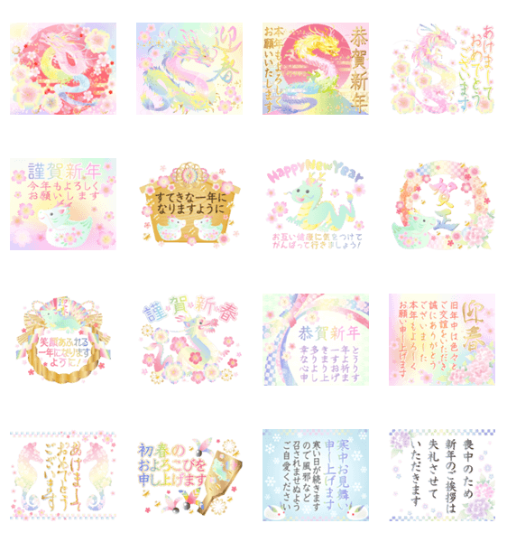 7色の龍が飛び出す、新年の挨拶に使えるおしゃれで華やかなお正月スタンプ。運気の上がるといわれているオーロラカラーをふんだんに取り入れた他にはない美しいデザイン。(あけおめスタンプ2024対象)