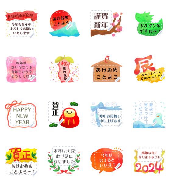 お正月の挨拶に使える和風の富士山・朝日の出・絵馬・梅・辰年・達磨・雪・2024・くす玉・吹き出しなどの文章を書き込めるフレームです。賀正★あけおめメッセージスタンプ 現在この商品は一部のスマートフォン版LINE 10.3.0以上のトークルームでのみ使用できます。動作環境の最新情報はヘルプをご確認ください。