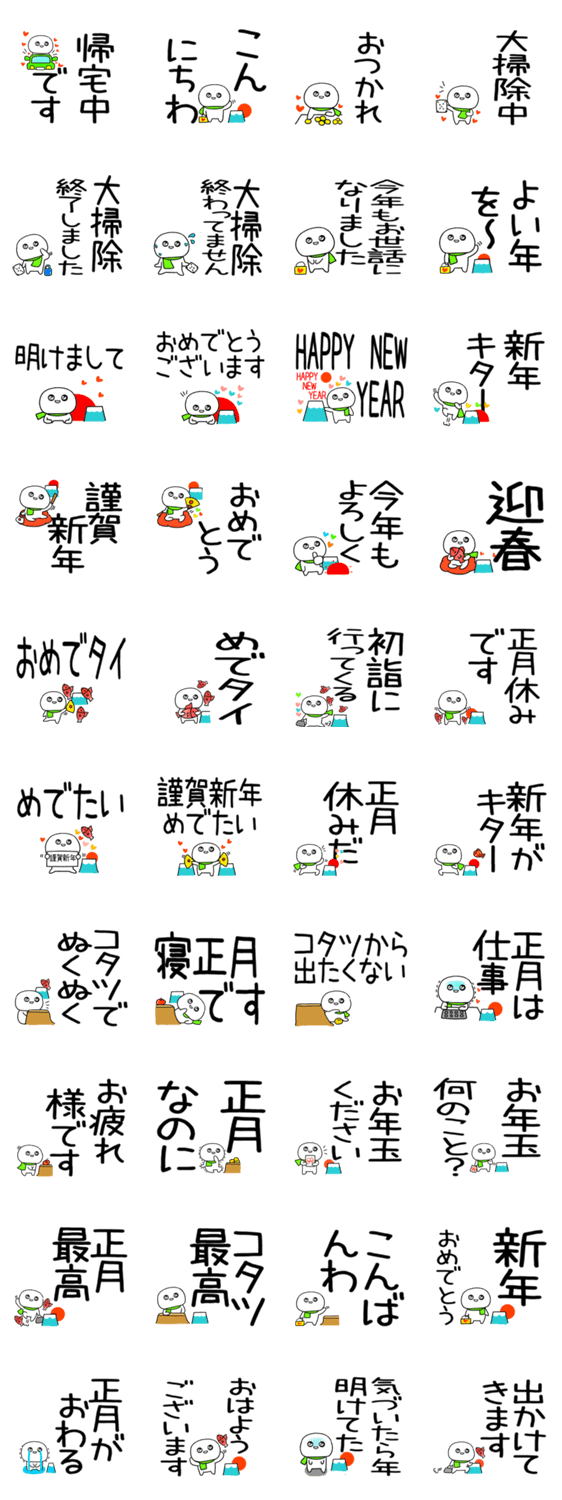 しろくてまるいキャラのおけおめスタンプです☆正月スタンプ☆もるきゅた作