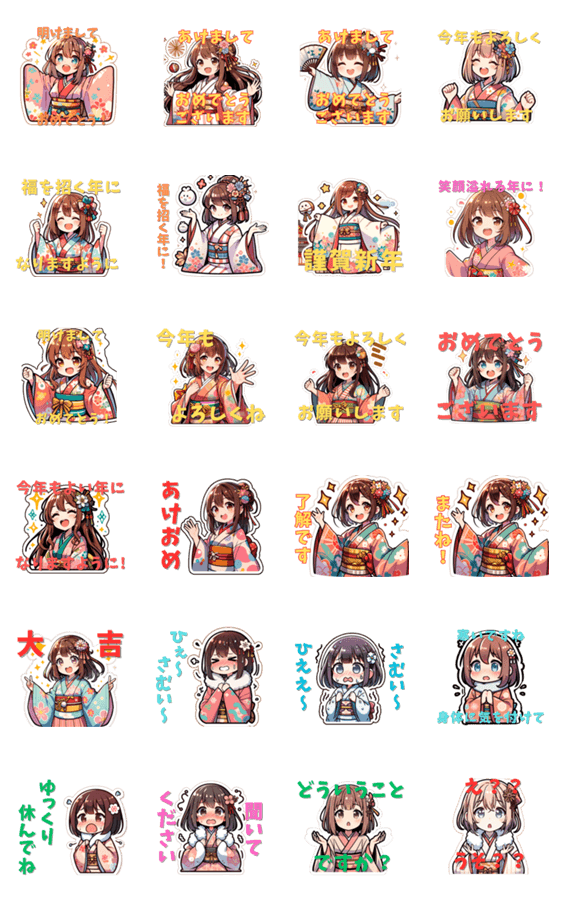お正月用のシール。日本のお正月を可愛い女の子が祝うシールをたくさん盛り込みました!お正月/使いやすい/新年/かわいい/女の子