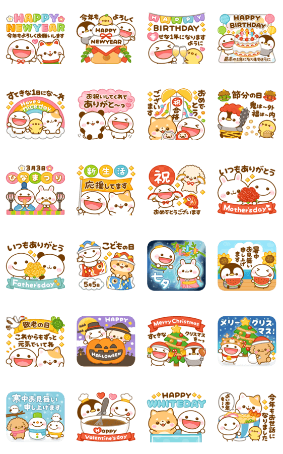 春夏秋冬・年末年始・季節のお祝いが揃ったポップアップスタンプです。 ちびマロ、ぺんぺん、にゃんこ、といぷーなどキャラ大集合! 柴犬/ペンギン/パンダ/猫/うさぎ/犬