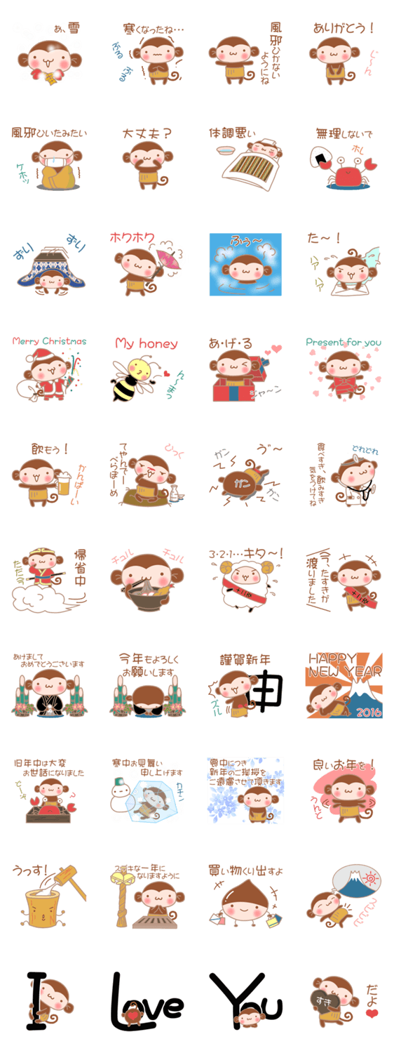 忘年会、クリスマス、お正月、バレンタインなど冬のイベントスタンプです。モン次郎&愉快な仲間達と一緒に楽しく新年を迎えてみませんか?
