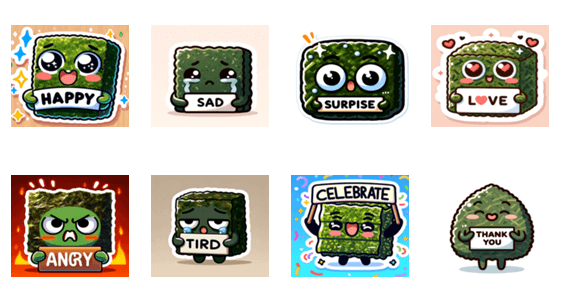 かわいい海苔キャラクターと一緒に、喜び、悲しみ、驚き、愛情、怒り、疲れ、お祝い、感謝の感情を表現しましょう!日常のチャットで使える、表情豊かなスタンプです。