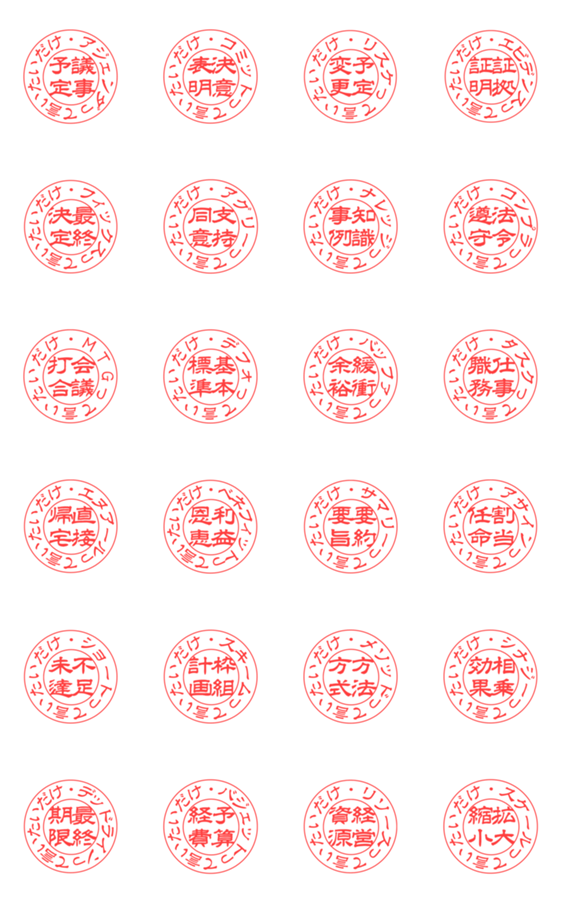 | スタンプ説明 | ビジネスシーンで良く使われるカタカナビジネス用語スタンプです。日本語の意味を四文字で付け加えてます。上司に使うと評価が下がります。後輩に使うと評価が上がります。 |