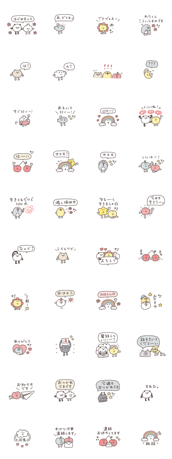 ゆるかわな生き物のあいさつスタンプです。 あいさつ/スマイル/手書き/くすみカラー/ペンギン/パンダ/トリ/うさぎ/くま/ねこ