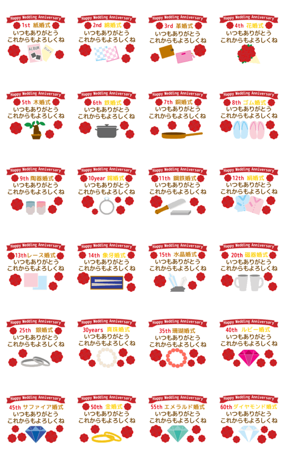 | スタンプ説明 | 結婚記念日1周年から60周年までのポップアップスタンプです。スタンプに日頃の感謝の気持ち送りませんか?10周年/30/5/40/35/鉄婚式/紙婚式/磁器婚式/金婚式/銅婚式/銀婚式 |